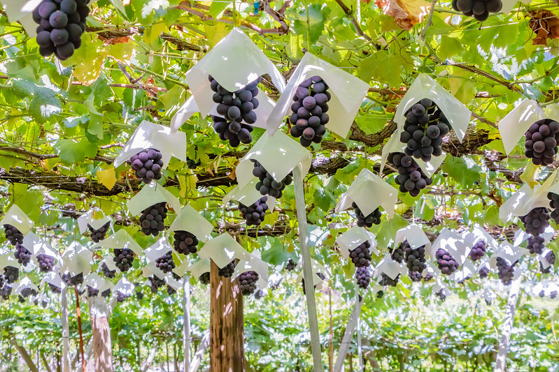 Kyoho grapes or “giant mountain grapes” are a cross between Ishiharawase and Centennial grape varieties. They are large, dark purple to almost black in color, and have thick skin. They can sometimes grow as big as plums and are usually peeled before being eaten. The flesh is juicy and sweet with mild acidity. Kyoho grapes were first produced in 1937 in Shizuoka Prefecture but were only named in 1946. They are produced today mainly in the prefectures of Nagano and Yamanashi.