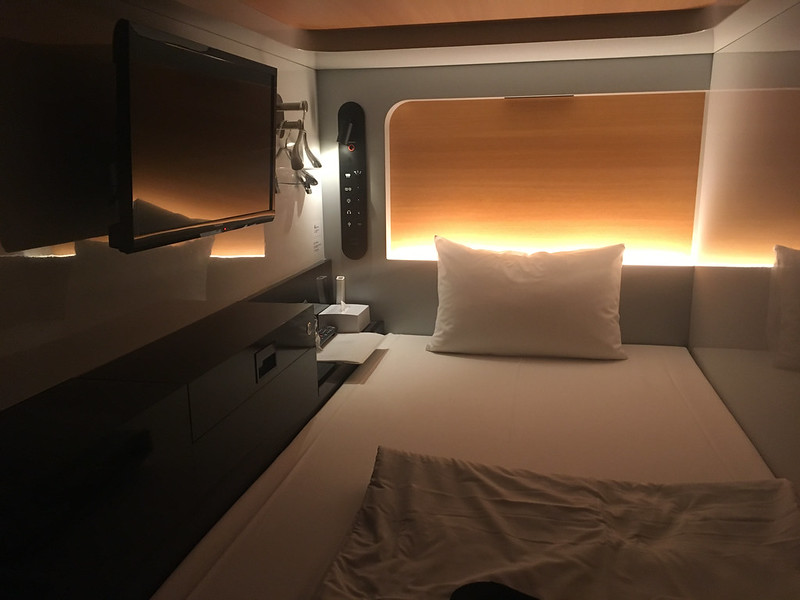 Inside a capsule hotel.